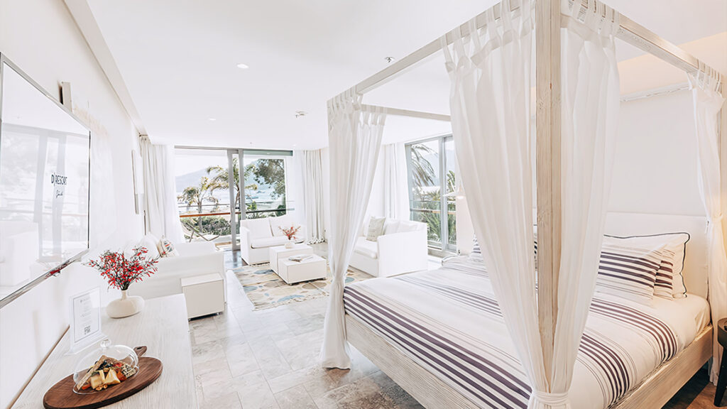 A serene decor dominated by shades of blue and white that captivates you at first glance. A mesmerizing view of the endless blue and green of the Mediterranean.
